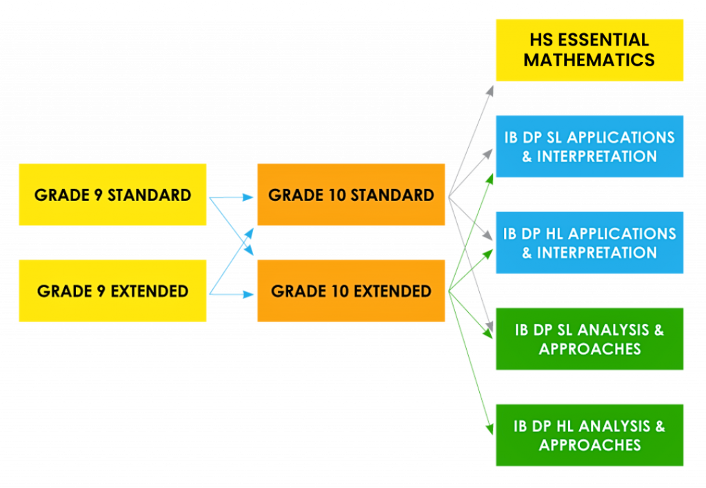 The IB allows schools to differentiate MYP mathematics at two levels: Standard Mathematics and Extended Mathematics. Standard mathematics aims to give students a sound knowledge of basic mathematical concepts. Extended mathematics consists of the standard mathematics framework supplemented by additional concepts and skills. In Grade 10, further differentiation is introduced in the form of the Mathematical Studies course enabling us to offer mathematics at three levels. Students studying Mathematical Studies in Grade 10 will complete modified assessments designed to meet their specific needs. Their levels of achievement will be adjusted at the end of Grade 10 to ensure they are comparable to the Standard Mathematics course. This is necessary for Mathematical Studies students to be eligible to receive the MYP Certificate at the end of Grade 10.